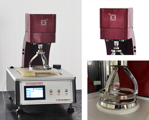 按FZ/T 01004-91標(biāo)準(zhǔn)規(guī)定的C法。壓力范圍0-100KPa,夾頭直徑113mm( 必要時(shí)可用直徑為31.5mm的夾頭)。勻速增壓,壓力上升到預(yù)定壓力值( 10-1100 kPa) 停機(jī),記下從達(dá)到預(yù)定壓力值起直到不接觸水的一面出現(xiàn)第一滴水珠止,所需的時(shí)間( s)。